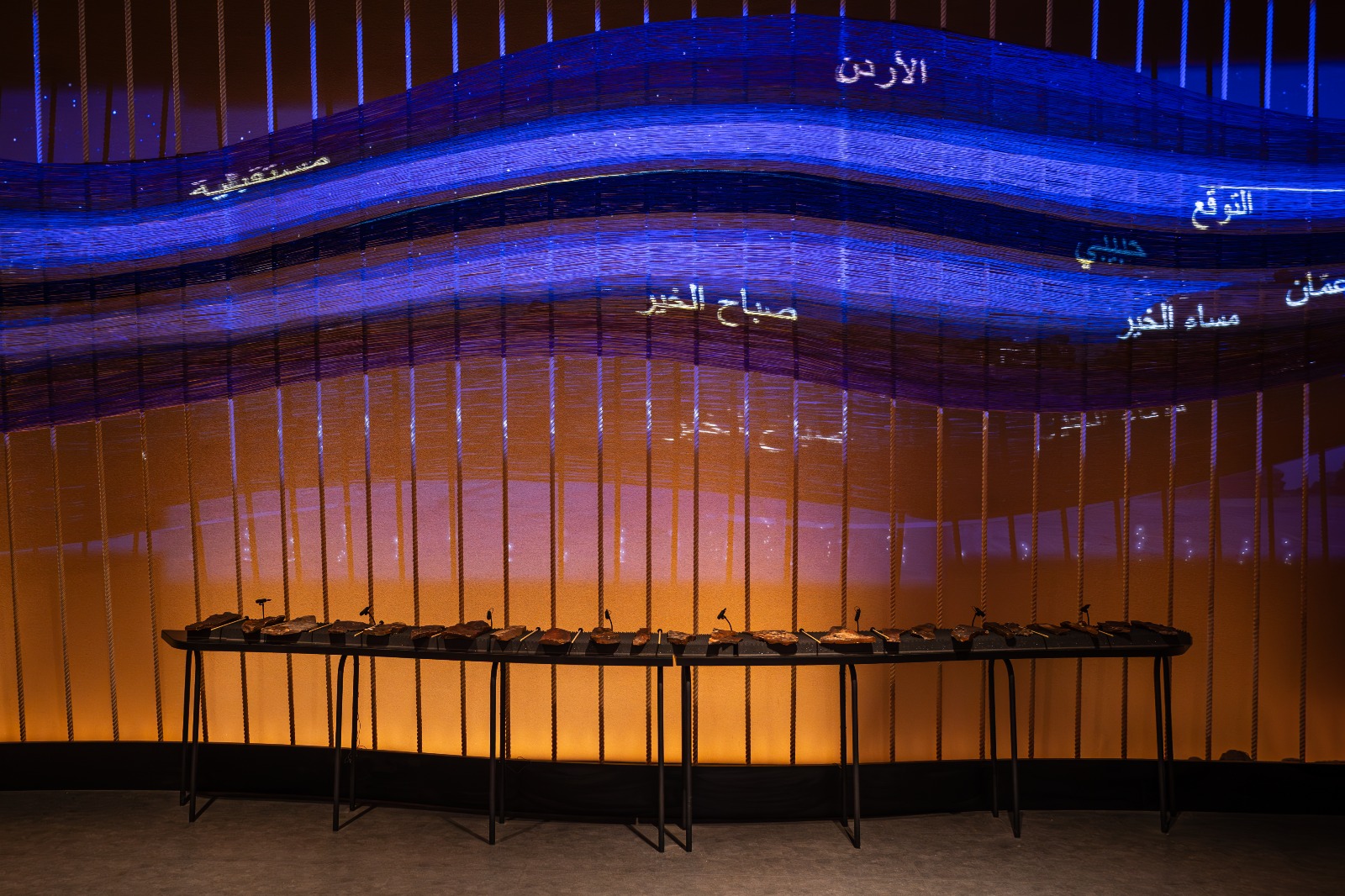 赤い土壁の後方に展示されるのが、ヨルダンのタペストリーです。ヨルダン出身で、現在ニューヨークで活躍する織物アーティスト・イシュラークさんの作品です。織物の下に置かれた火打石をスティックで叩くと心地よい調べが。音に連動してタペストリー上にアラビア語などの映像が流れます。