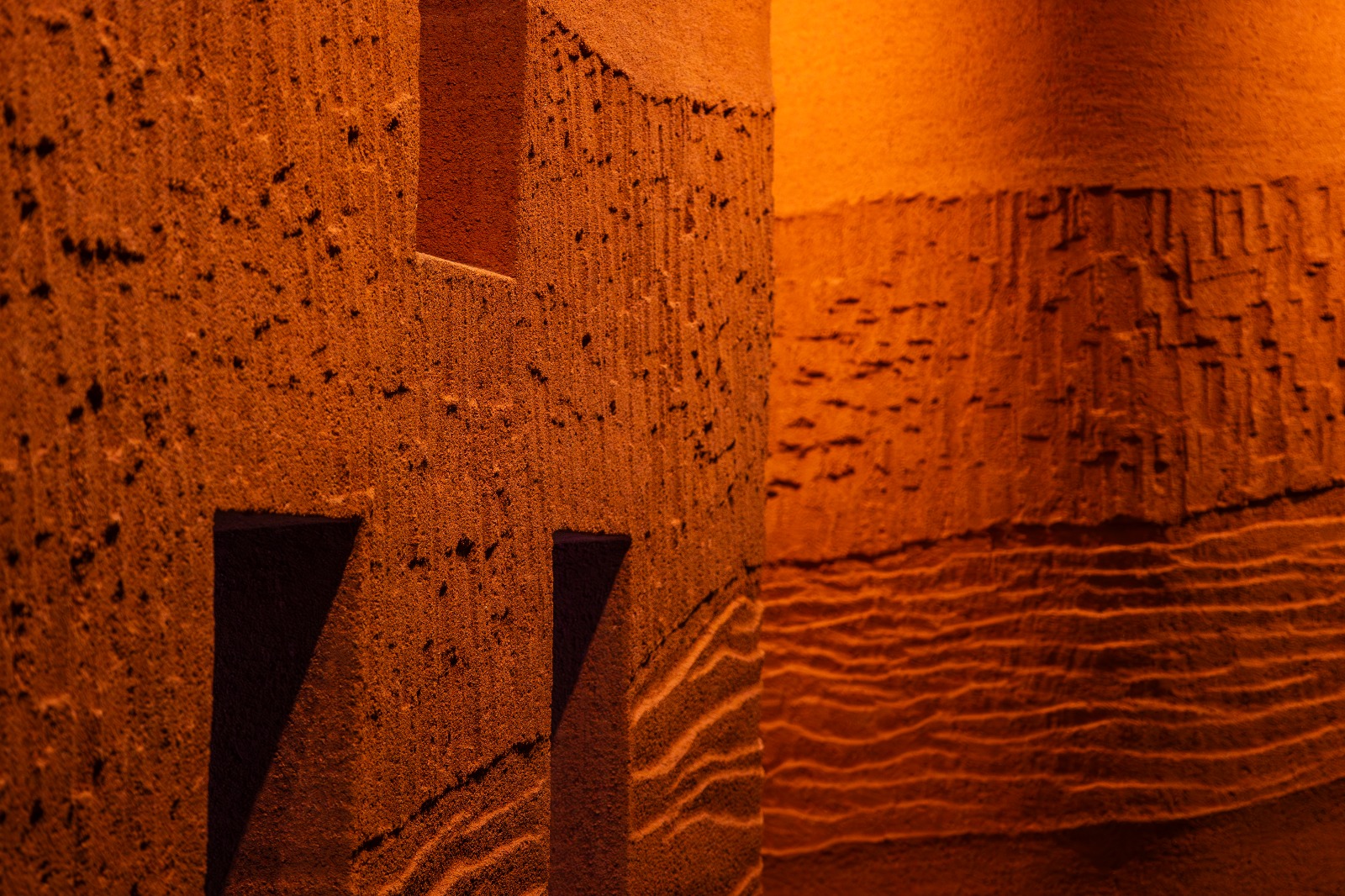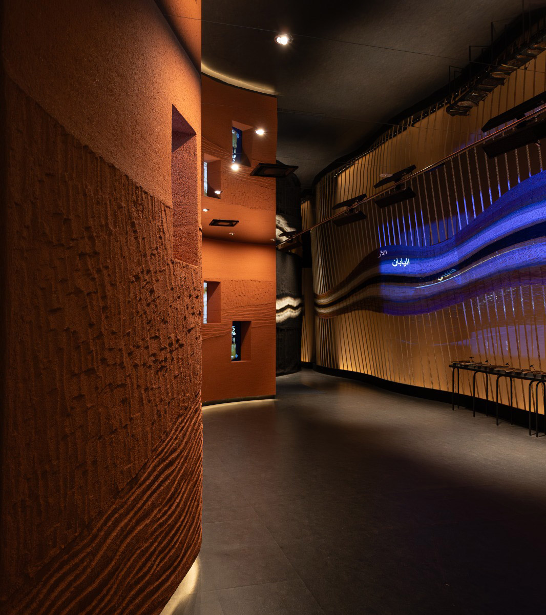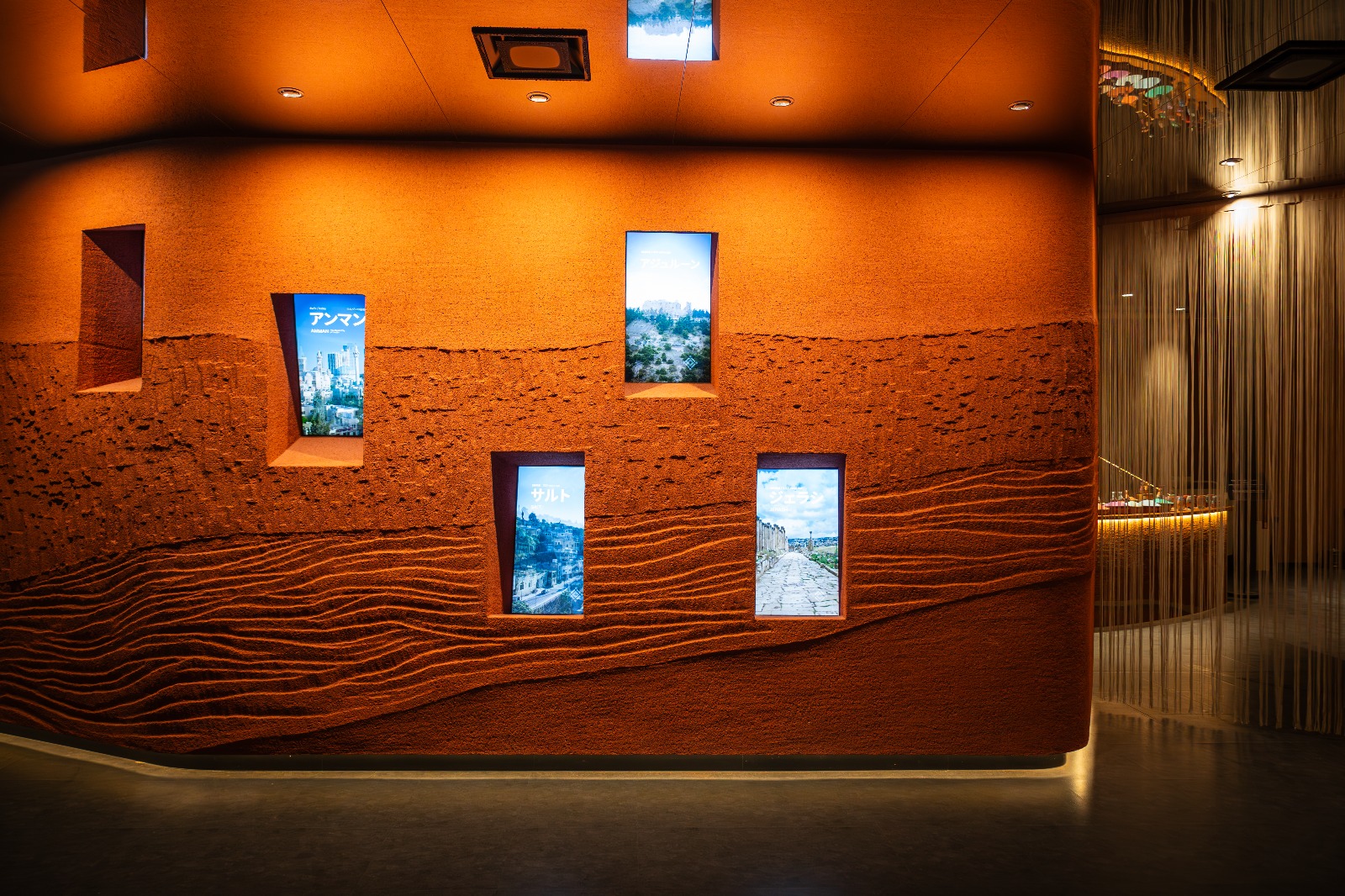 ヨルダン館のプロローグ「時の流れの部屋」には、赤い岩をイメージした土壁があります。この土壁は、日本の左官職人・久住有⽣(くすみ なおき)さんが手がけたもの。壁に設けられた小窓からは、首都アンマンや世界遺産の街アル・サルト、緑豊かでお城のあるアジュロン、世界遺産ペトラ遺跡の様子がうかがえ、順を追って観ることで、ヨルダンの歴史を辿れます。