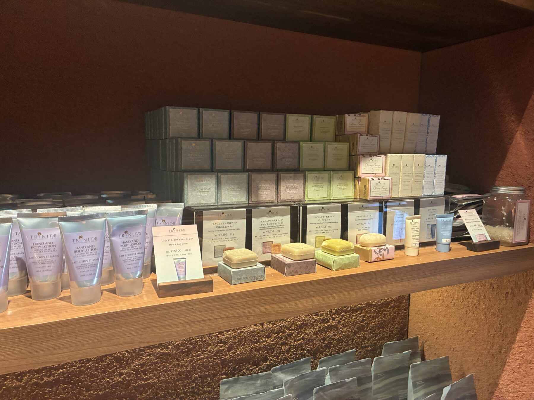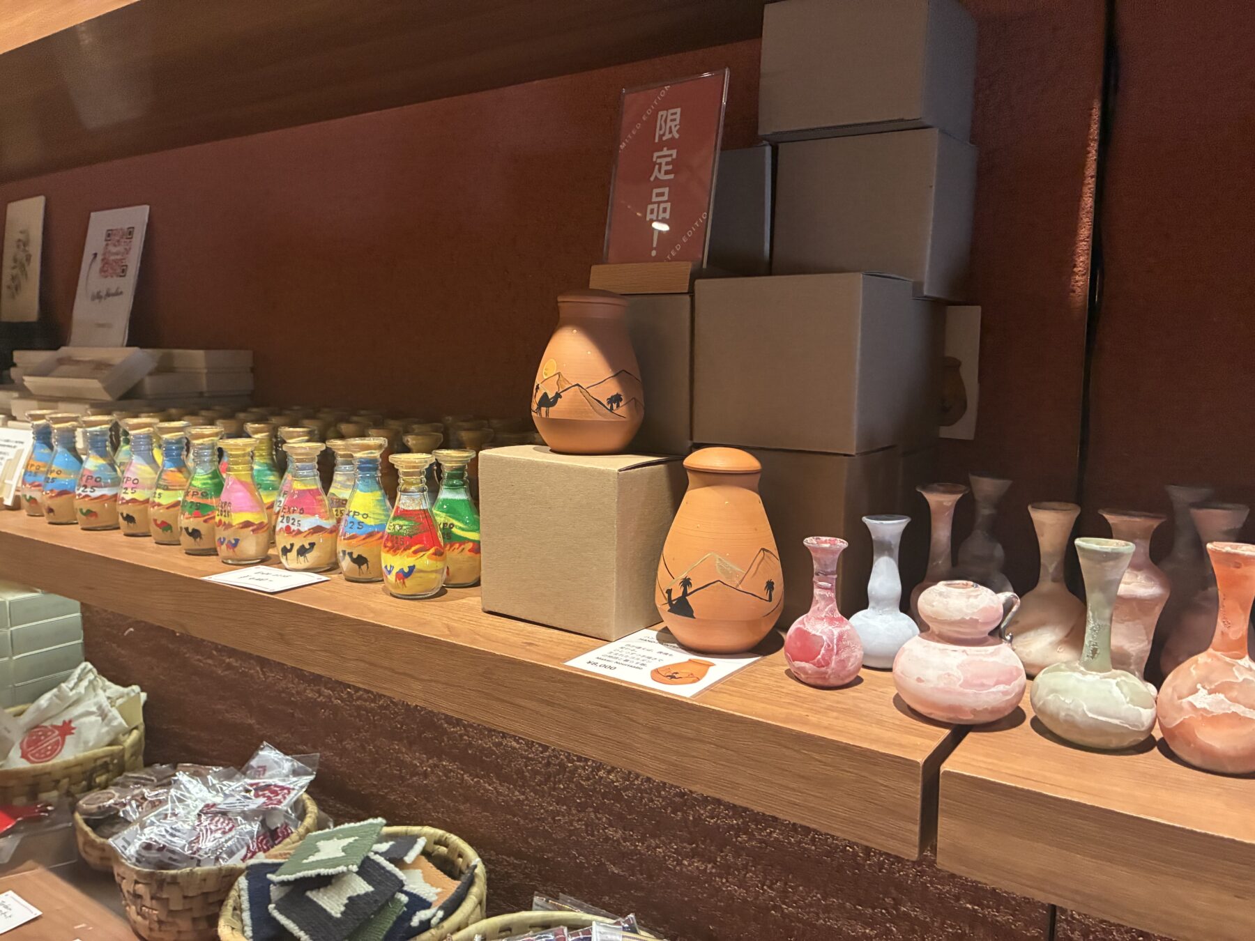 館内1階のカフェ&ショップでは、ヨルダンの特産品などさまざまな商品が販売されています。カラフルな砂をガラスボトルに詰めた「サンドボトルアート」は、お部屋に飾って鑑賞できるヨルダンの代表的な工芸品。死海の泥や塩を材料にしたバスソルト、泥パック、ハンドクリームなど死海コスメは一番人気。ほかにも、ヨルダン産の上質なオリーブオイルやフムスなどの食品も購入できます。お土産にして、ヨルダンの文化や風土を自宅でも楽しんでください。
